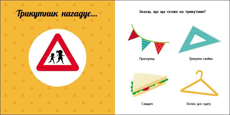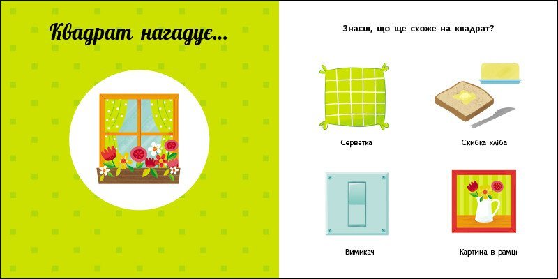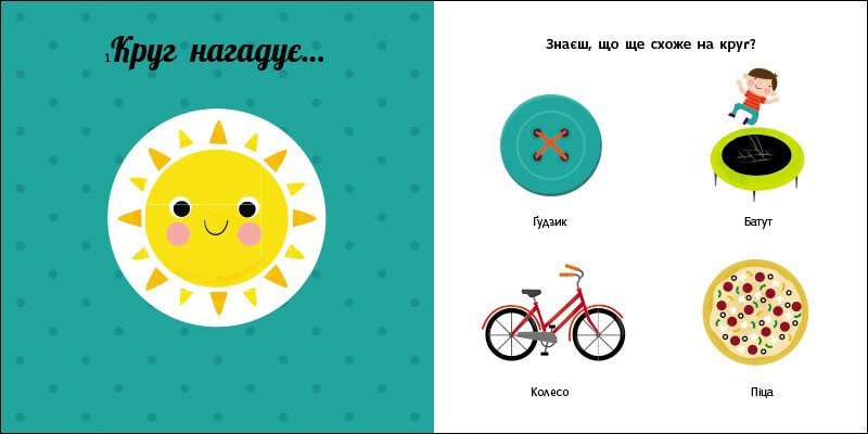 Квадрат, круг, трикутник… Які фігури ти знаєш? Обертай колесо та вивчай шість основних фігур! А на сусідній сторінці тренуйся, розглядаючи милі ілюстрації з предметами певної форми. Нехай навчання буде цікавим і веселим!